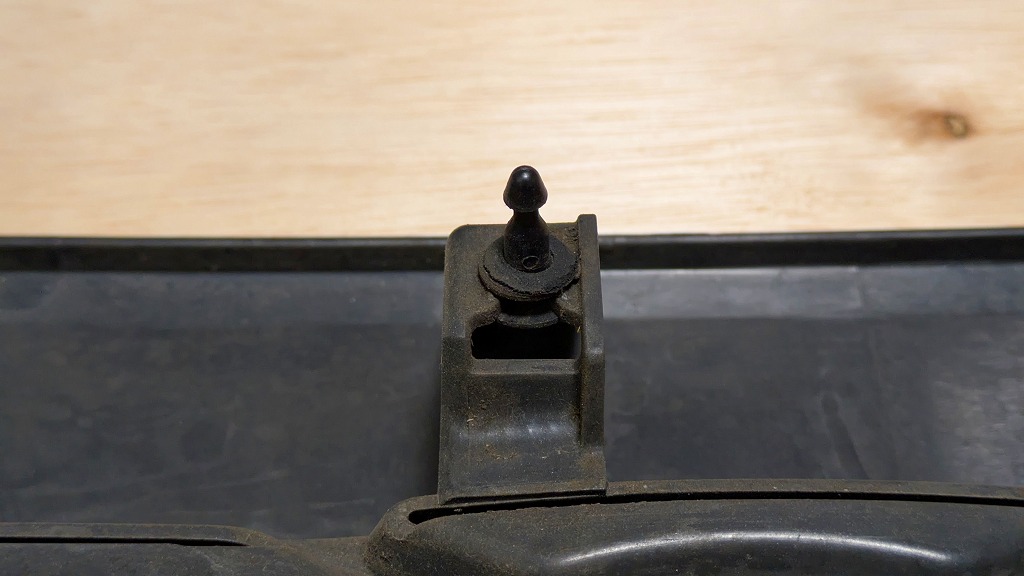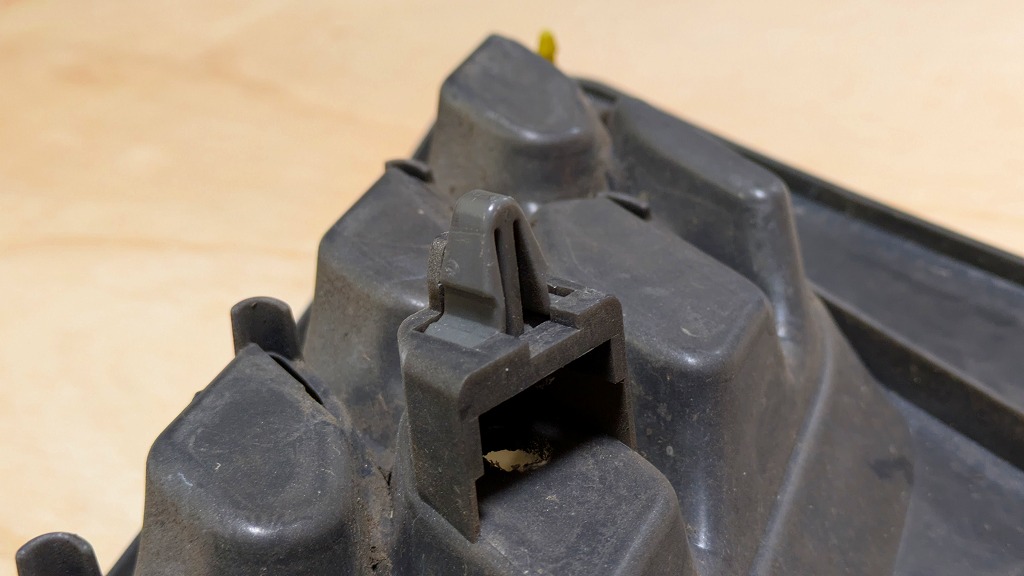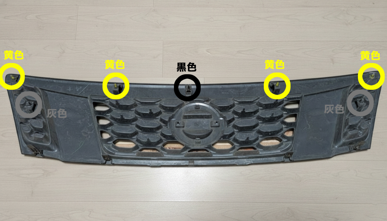 下画像のグリルはNV350キャラバン(1型)の通常モデルのグリルの裏側です。クリップは黄色、黒色、灰色の3種類あり、全7箇所で固定されます。グリル下側はグリルに形成されている爪6箇所で固定。※画像のツメは2カ所欠損。